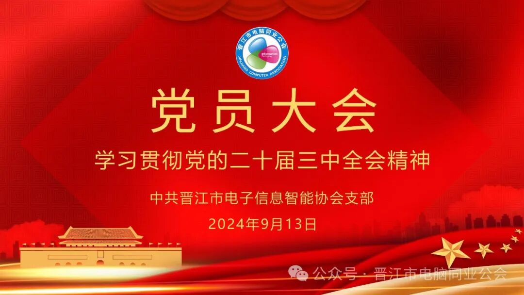 9月13日17点,中共晋江市电子信息智能协会支部召开党员大会,主题是学习二十届三中全会精神,观看报告视频,学习交流。