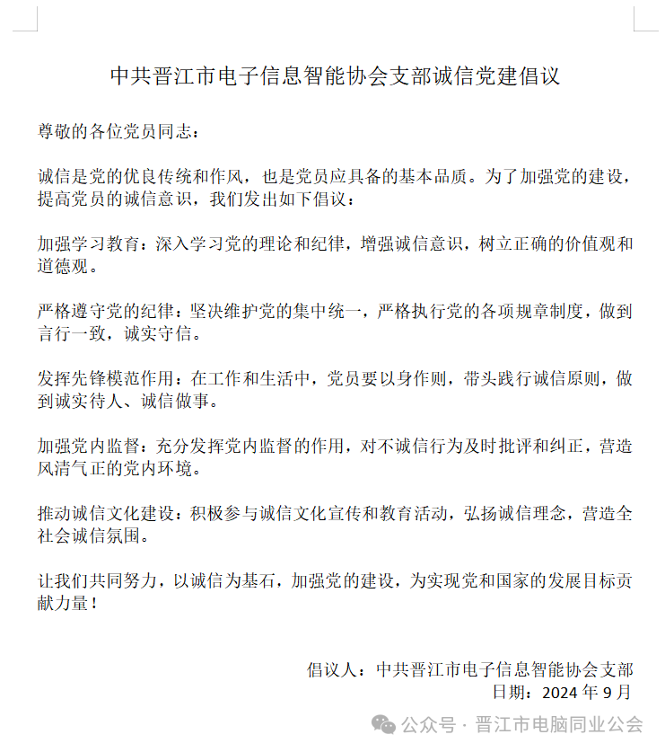 诚信党建倡议书