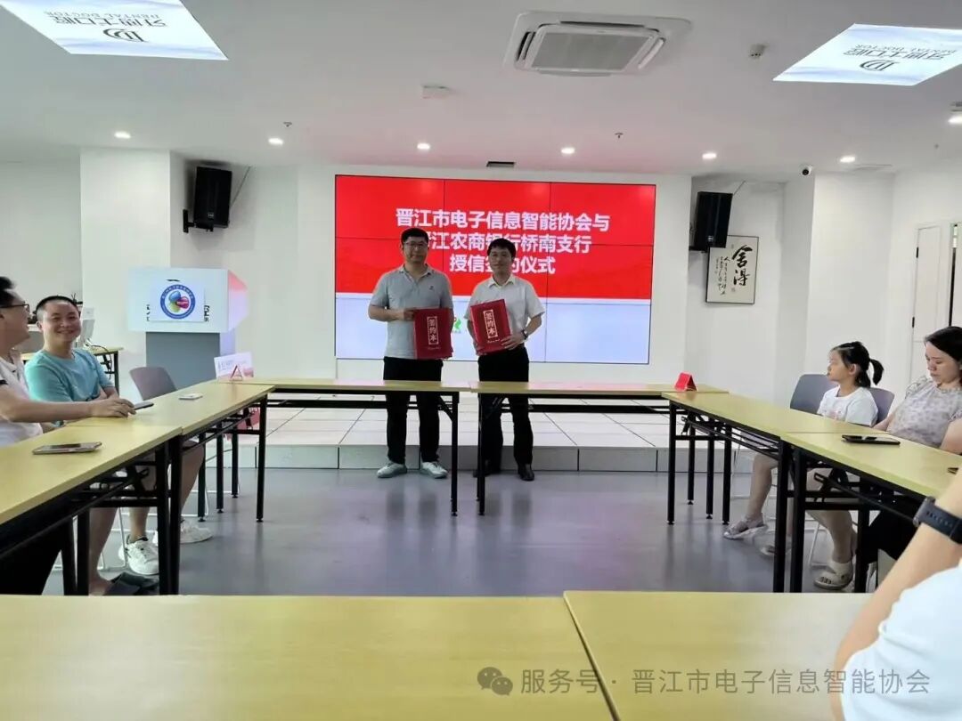 7月18日,晋江市电子信息智能协会与晋江农商银行桥南支行开展授信授牌仪式。活动现场,晋江农商银行桥南支行为晋江市电子信息智能协会提供5000万元授信支持,并为协会成员进行惠企政策解读,协会成员申请信用、保证类贷款,贷款利率可低至4.5%,精准对接融资需求,助力企业成长。